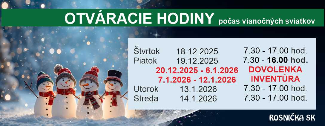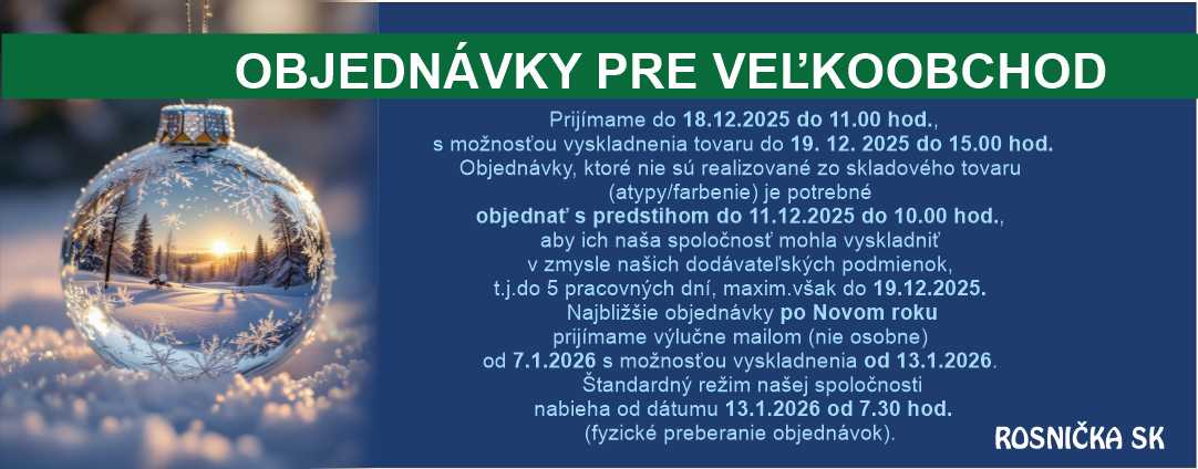 OBJEDNÁVKY prijímame do 18.12.2025 do 11.00 hod., s možnosťou vyskladnenia tovaru do 19. 12. 2025 do 15.00 hod. Objednávky, ktoré nie sú realizované zo skladového tovaru (atypy/farbenie) je potrebné objednať s predstihom do 11.12.2025 do 10.00 hod., aby ich naša spoločnosť mohla vyskladniť v zmysle našich dodávateľských podmienok, t.j.do 5 pracovných dní, maxim.však do 19.12.2025. Najbližšie objednávky po Novom roku prijímame výlučne mailom (nie osobne) od 7.1.2026 s možnosťou vyskladnenia od 13.1.2026. Štandardný režim našej spoločnosti nabieha od dátumu 13.1.2026 od 7.30 hod. (fyzické preberanie objednávok).